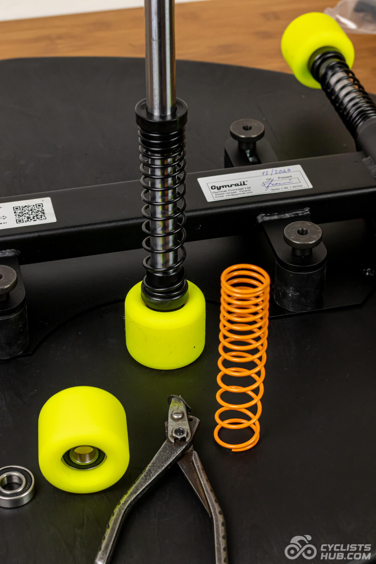That’s why I’ve tried several settings and sprint styles. I also tried soft and medium springs. Sprinting was better with the medium (orange) ones. By the way, be careful when replacing them. The whole system is loaded, so the wheel can shoot out as soon as you unlock the Seeger ring. That’s why it’s a good idea to do a two-man swap, with one person holding the wheel so it doesn’t shoot out.