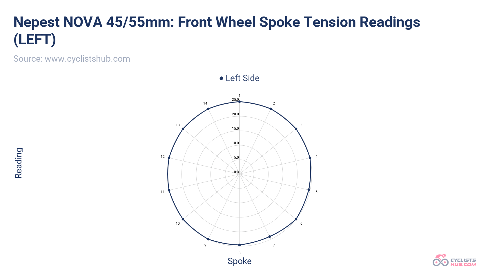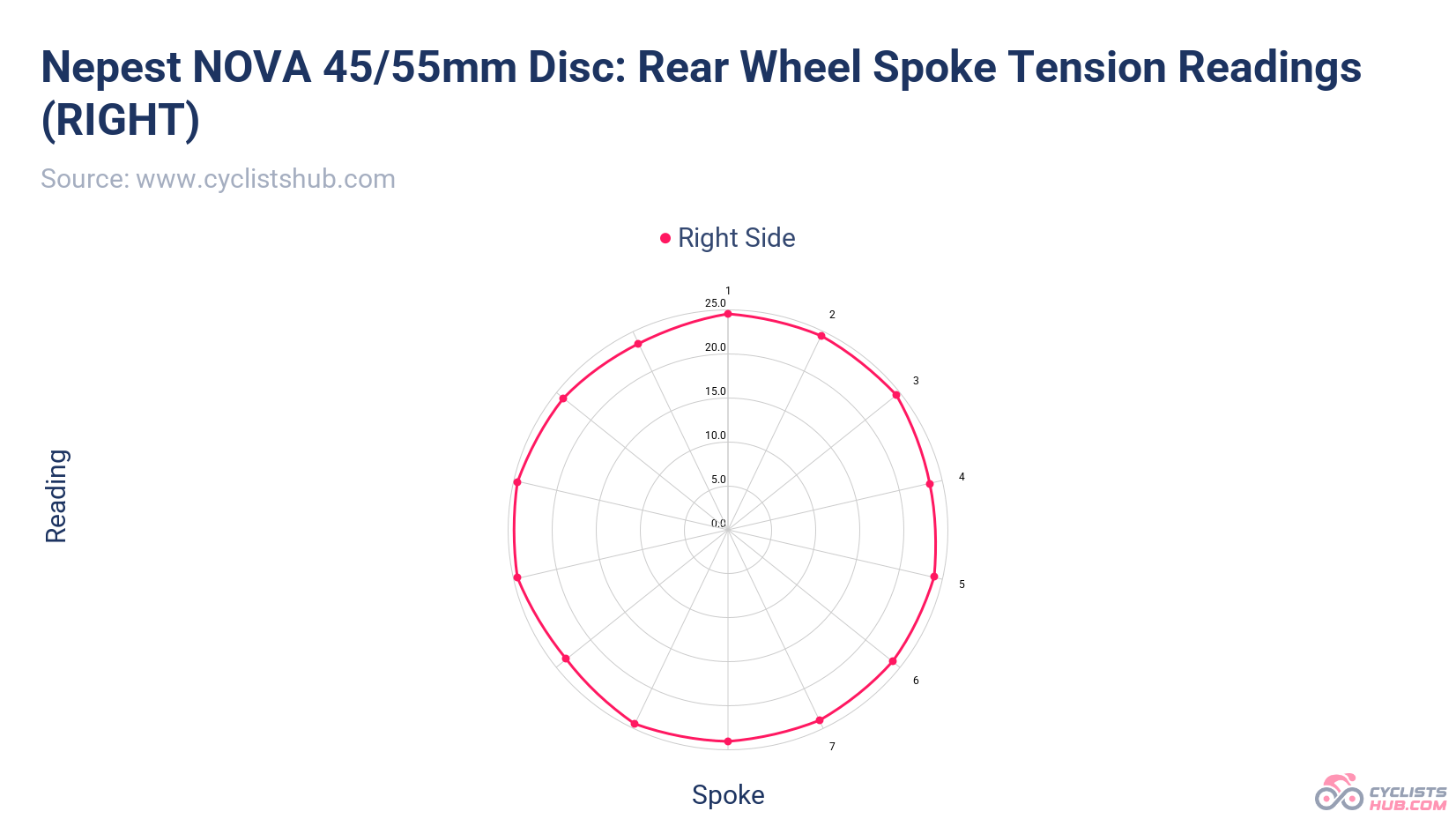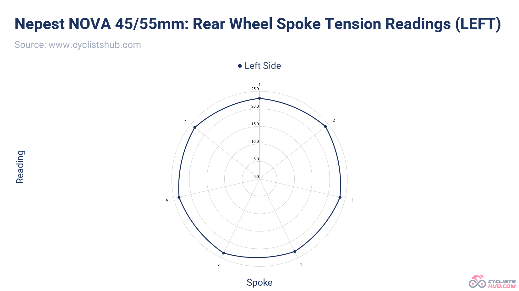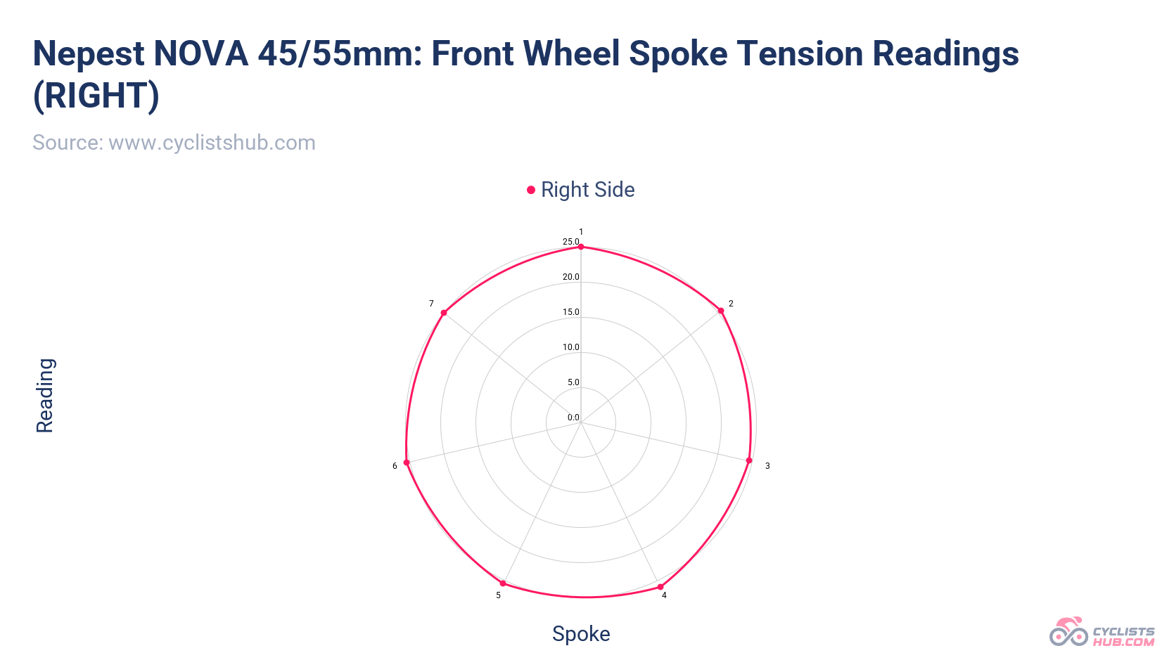 The spoke tension was also great, showing a high level of consistency. No spoke was off by more than 5% of the average. Similar to the DRIVE II and HYPER 5 wheels, this was one of the best results I recorded.