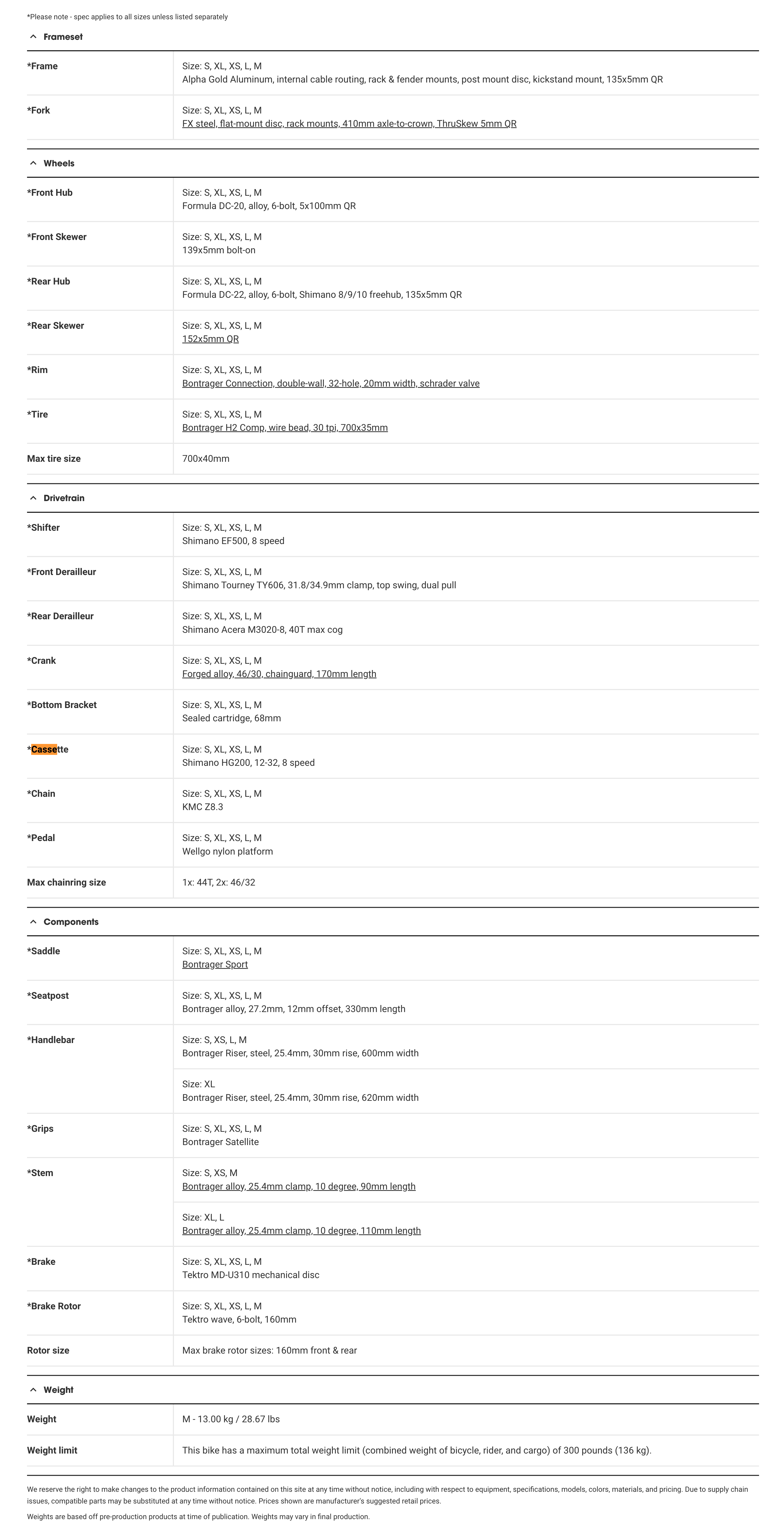 | Pedals | Wellgo nylon platform | Bontrager City pedals | Bontrager City pedals | Bontrager City pedals | Bontrager City pedals | Bontrager City pedals |